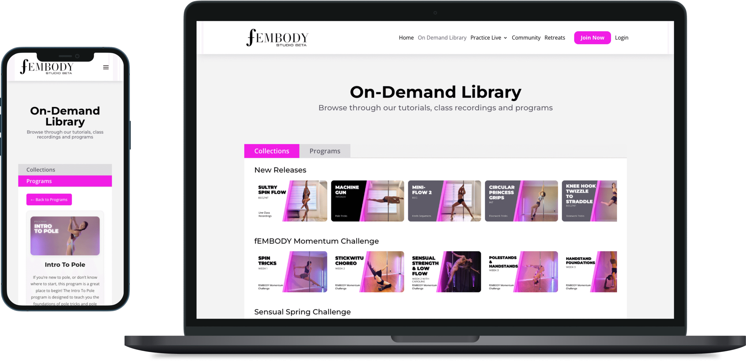 fEMBODY Studio was my first experience learning pole online and I wasn’t sure what to expect, but I was so surprised at how seemless the platform was to use! All the content was broken down in easy to navigate categories which allowed me to easily pick and choose what I wanted to learn and be able to determine what was within my skill level and progressions. As I take in-person classes with Kiana as well, it was amazing to me that learning from her platform online felt the same as learning from her in person!…